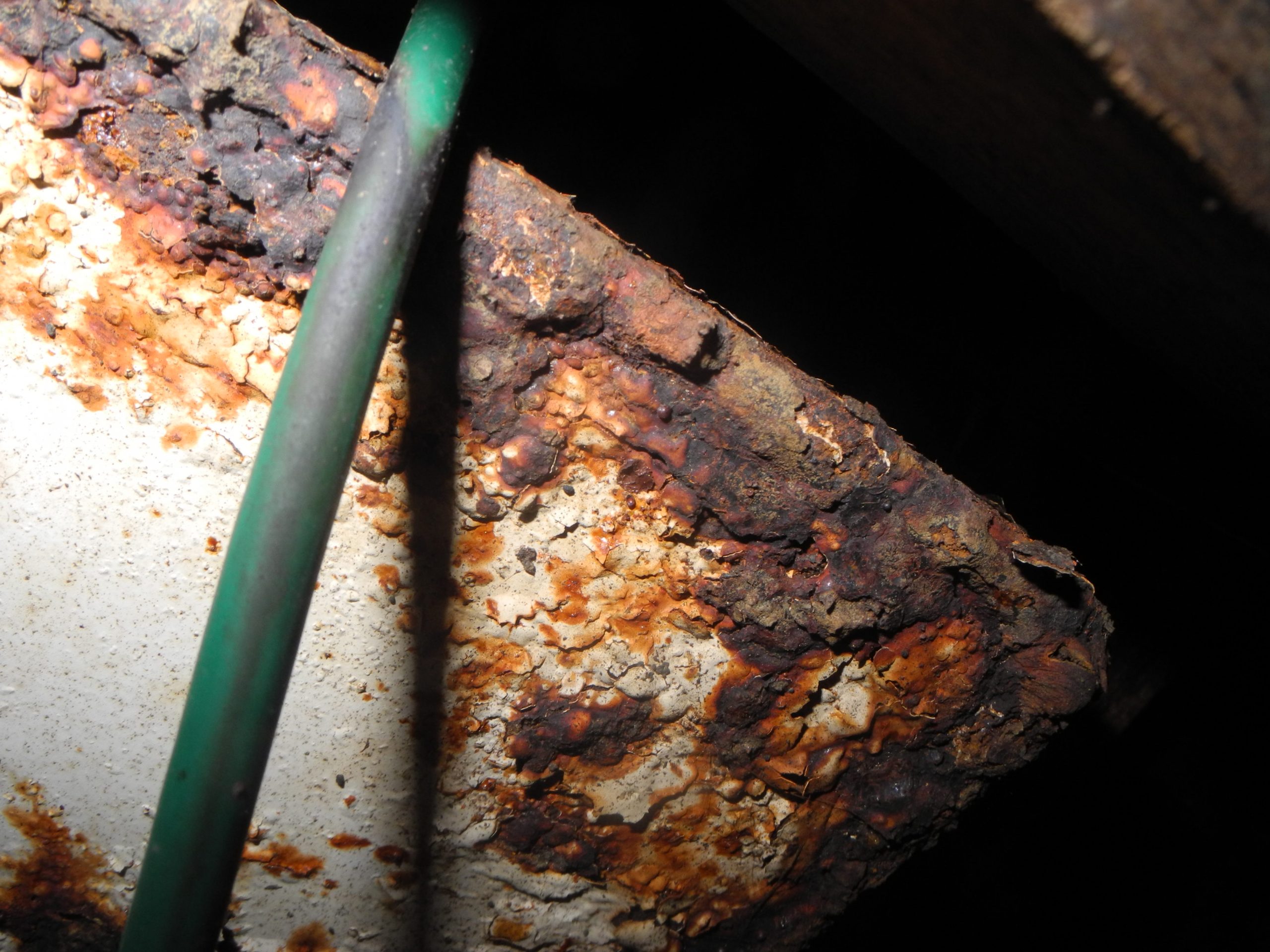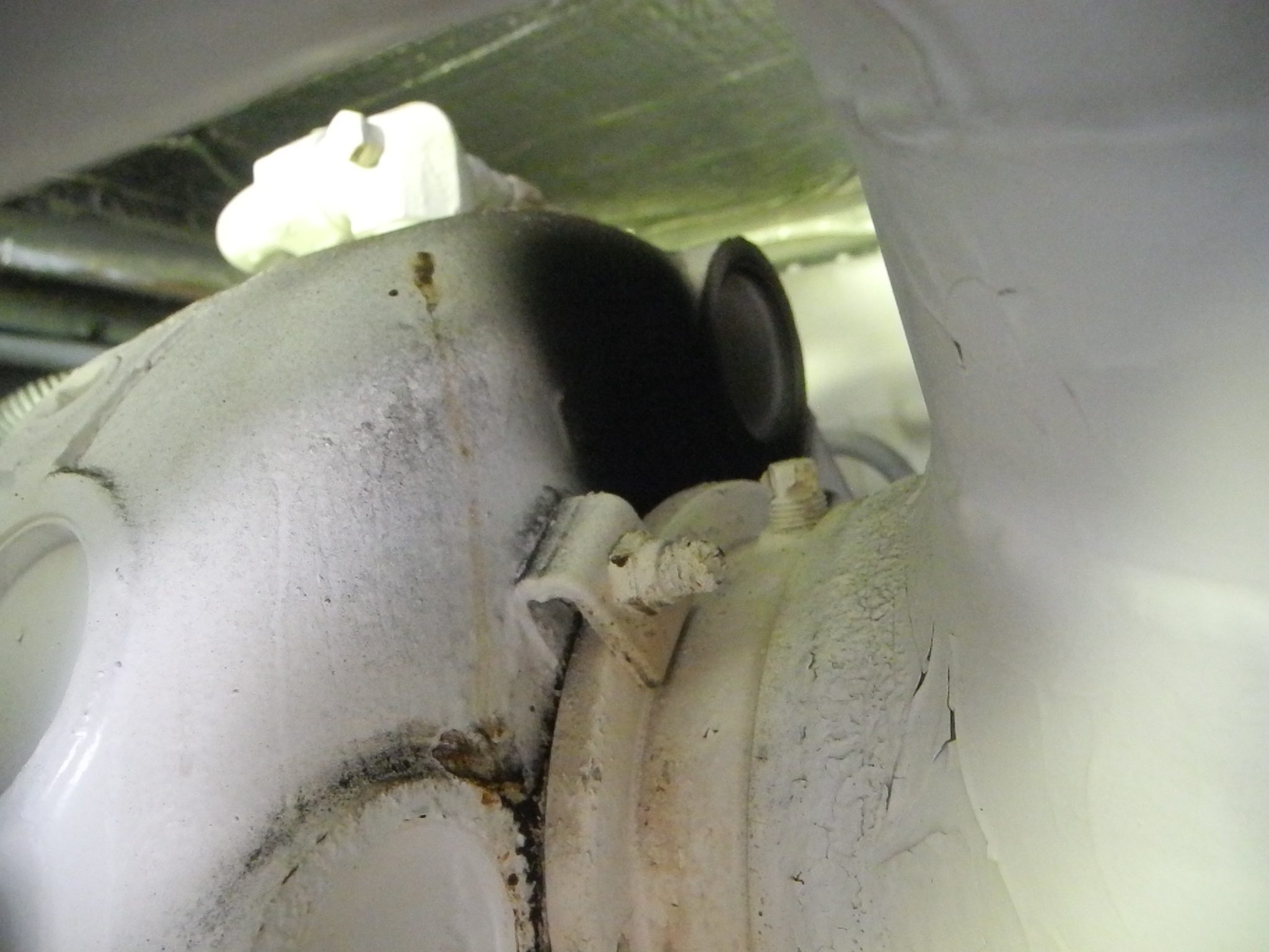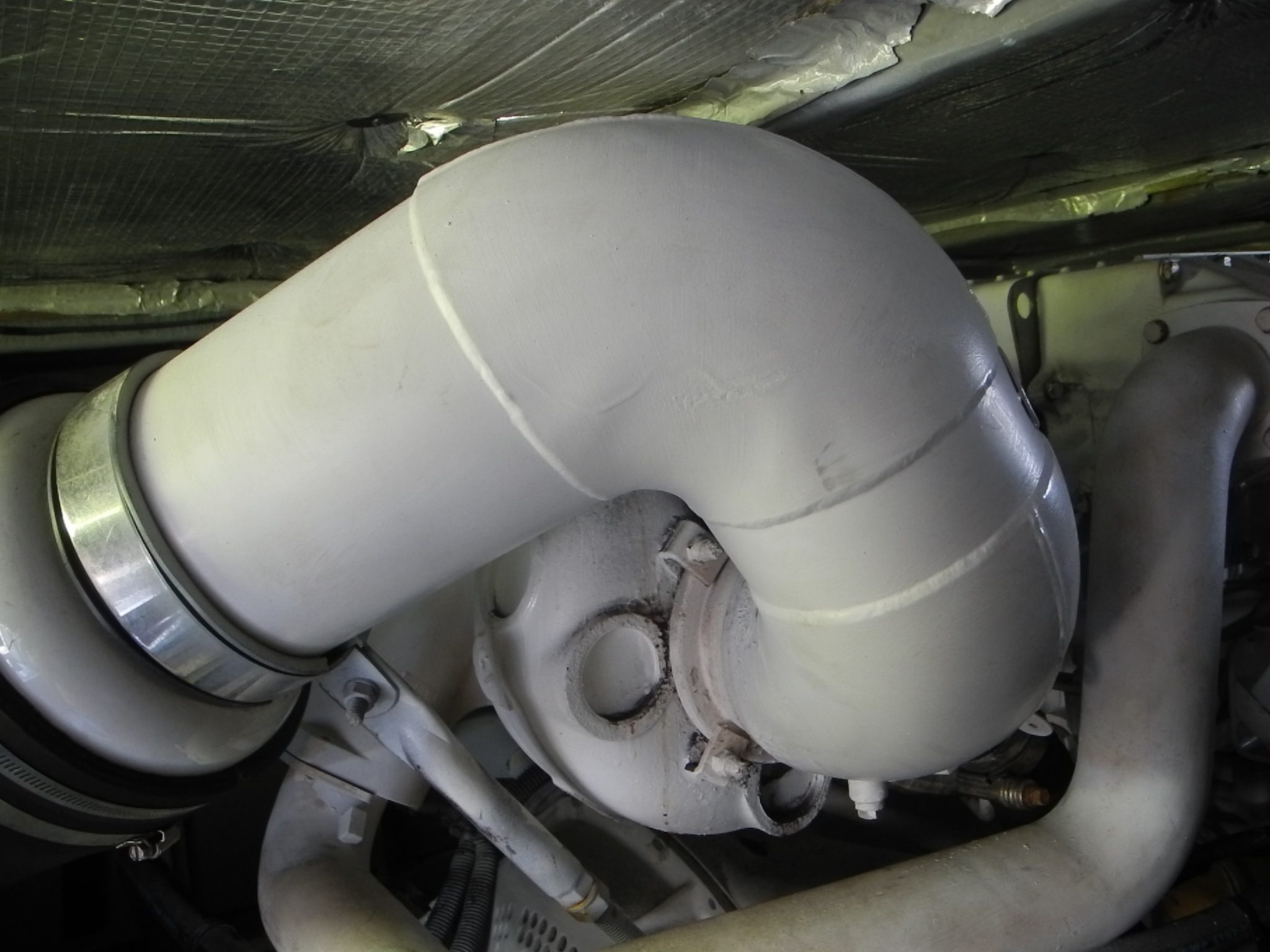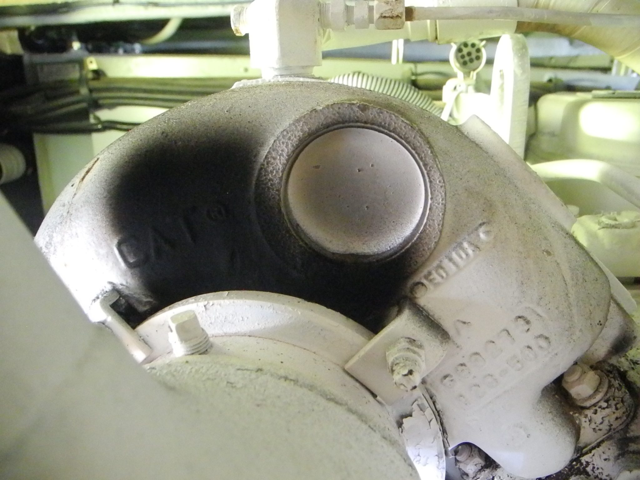 Aboard a clean and seemingly well cared for boat and we pop into the engine room. What is the BIG BLACK SPOT? That is an engine exhaust leak. See the black carbon soot leaking out between the turbo and exhaust flange? Look at the bolts and the major clips holding everything together. This could simply be a gasket leak or a major problem with a metal flange crack. And if it is just the gasket this is no ordinary gasket.