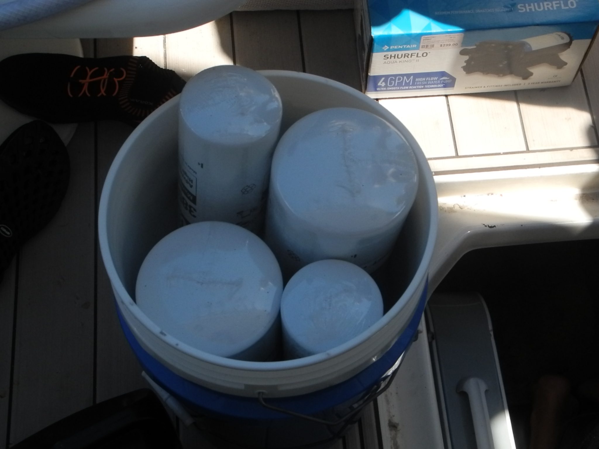 - Spare filters should NEVER be stowed in a bucket. Not IF but WHEN you have a water leak the bucket will collect the water and ruin your filters. Better to stow them in a basket or cardboard box to prevent water damage.