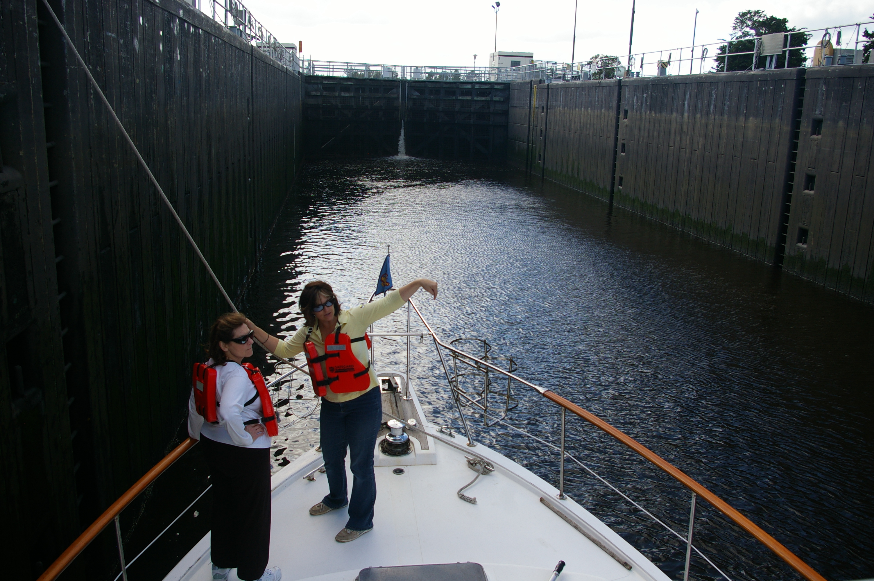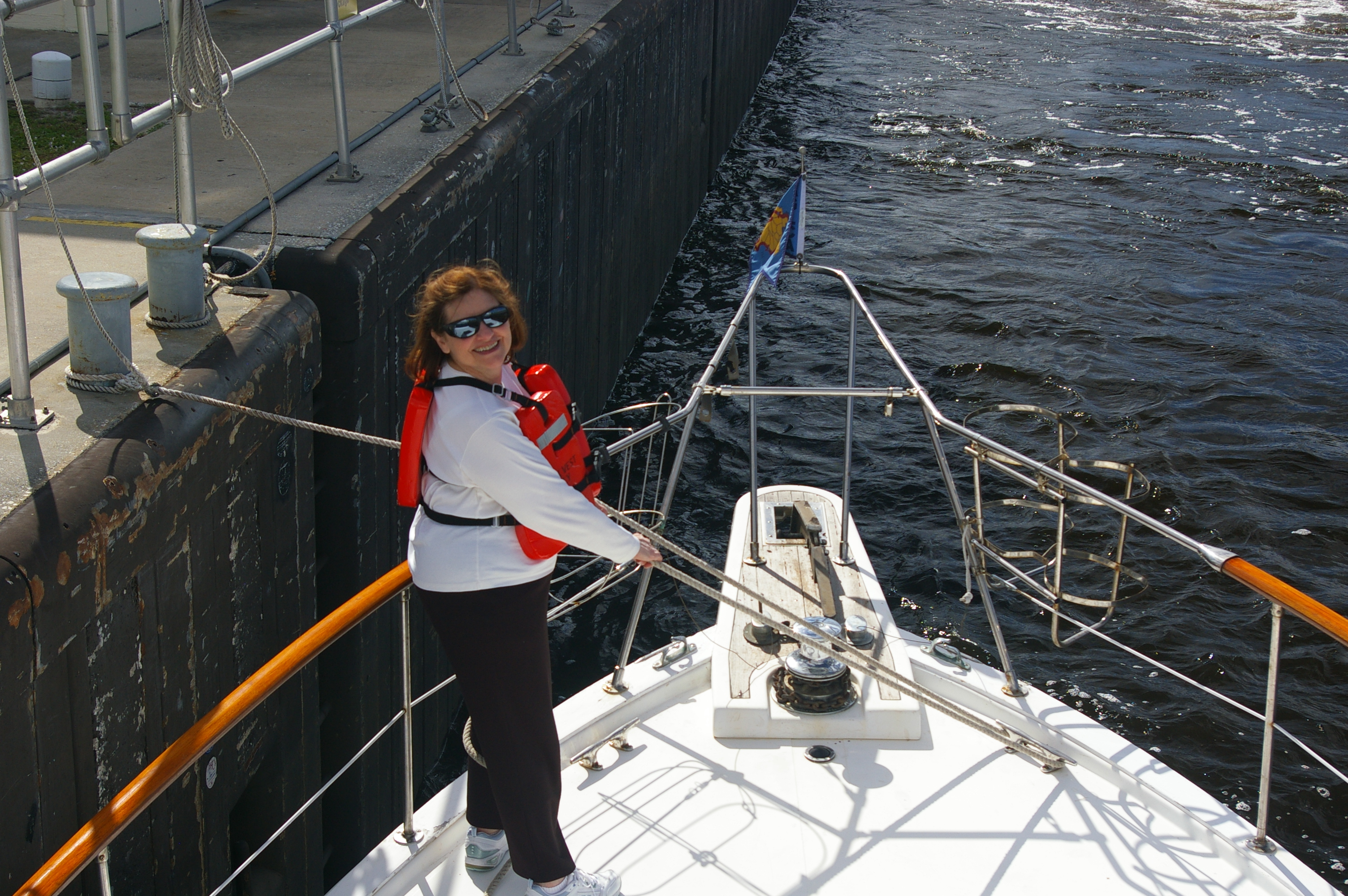 To help them prepare for their yearlong cruise we introduced this soon-to-be looping couple to the concept of locking through the Okeechobee Waterway at the St. Lucie Lock. After locking up we rose 14 feet to meet the current lake level. Great job working as a team, adjusting lines and communicating throughout the event. Now we can cruise to the River Forest Yachting Center where we dock and visit a few boats in storage on the hill. Seeing boats out of the water frequently leads to great discussions about hull forms and thruster installations. After lunch we head back east and lock through once again, lowering 14 feet to sea level…onward to our next anchorage.