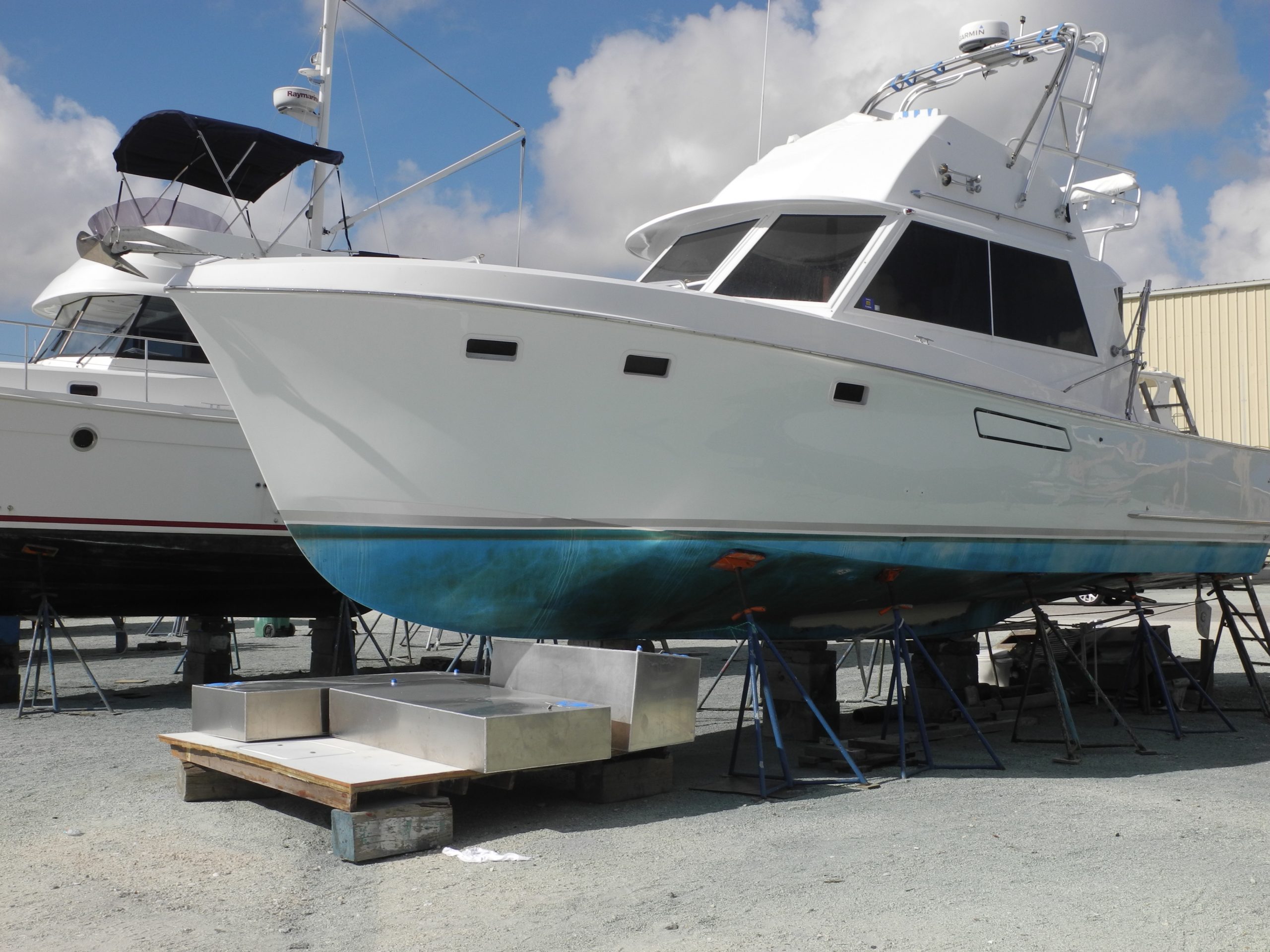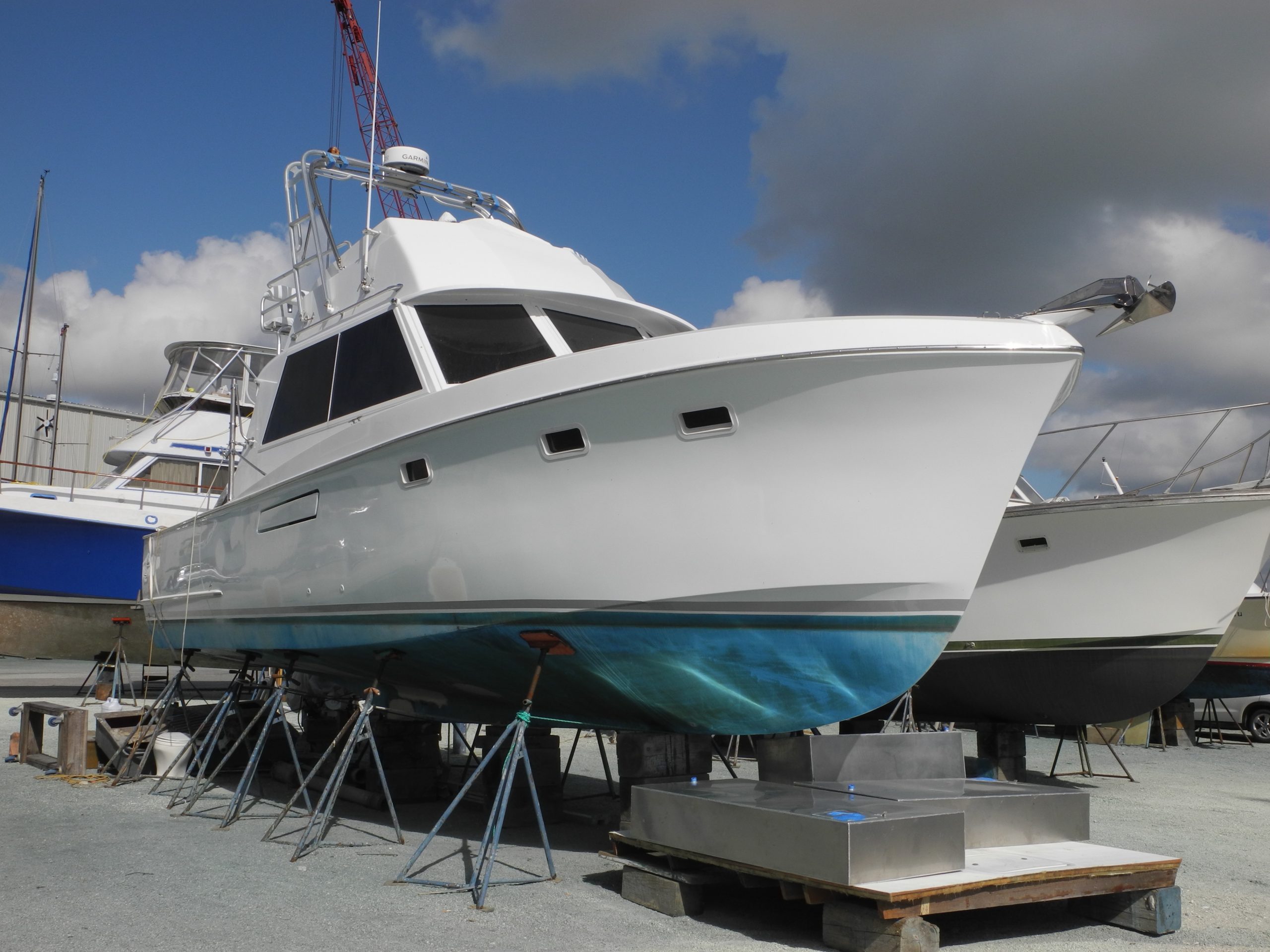 In the oil field and industrial marine world I have heard the term Life Extension Project. This is not simply rebuilding but totally outfitting the boat to newer standards. In the case of this Classic Hatteras Rebuild, I may assume the boat has been totally gutted. Look at all the gear – old and new- that is lying nearby and under the hull in the boatyard. It seems that everything is being reinstalled as brand new or totally rebuilt.