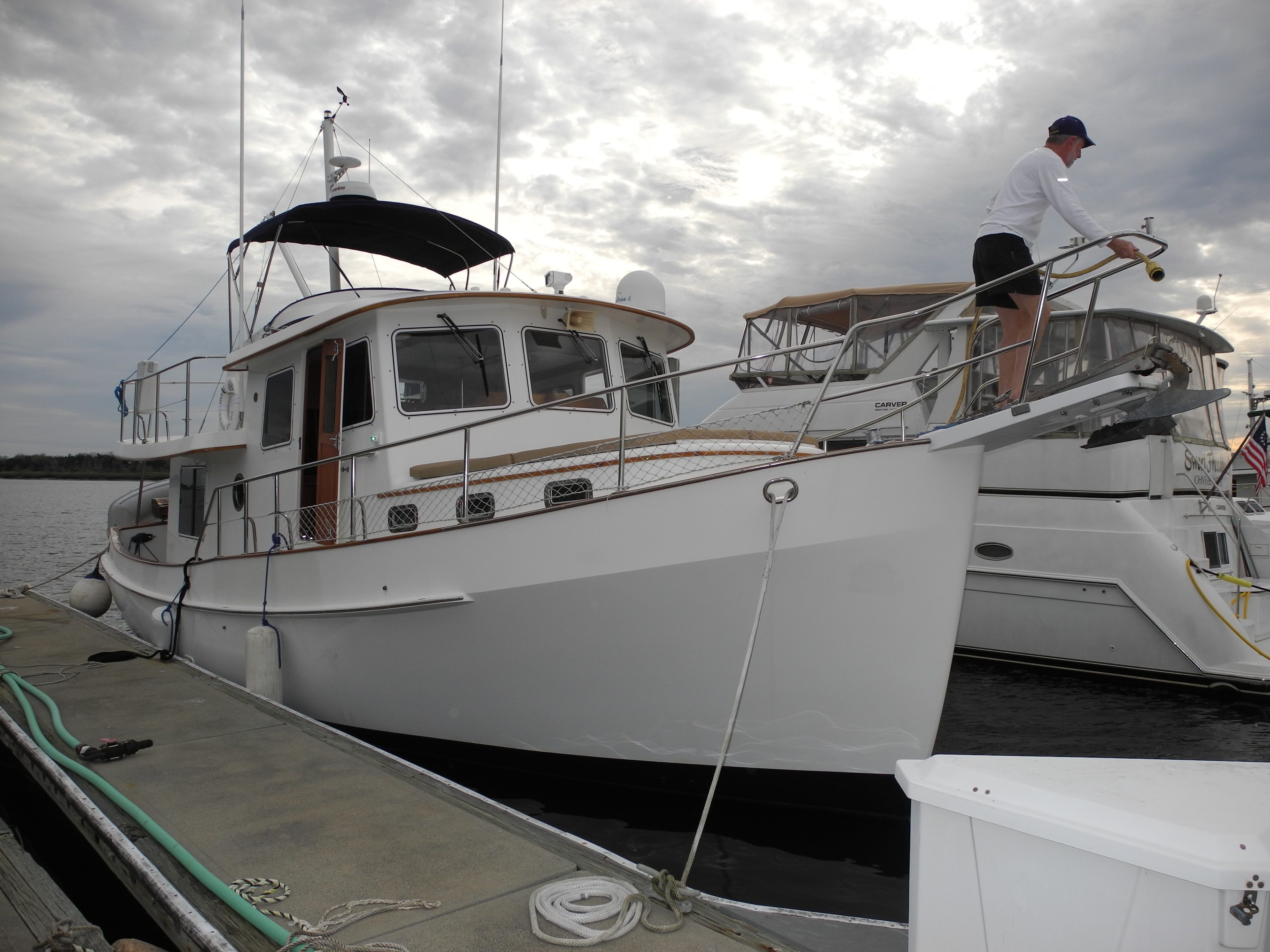 We met first at TrawlerFest, presenting many different seminars. Then, our first “training” was via our set of Ask Captain Chris videos. It is amazing what you can learn by watching any of our training topics such as Docking, Locking, Anchoring, Bridges and The Perfect Boat. Next, this couple asked me to attend a survey of what they thought was their future boat. Acting as a translator for them, I was able to make sense of what sometimes seems like a foreign language during the survey and help them to understand the report which follows. While that particular boat failed survey, they learned so much from the experience. Now prepared to forge ahead, they quickly found a sistership in better condition. So let’s fast forward to my arrival at Halifax Harbor Marina in Daytona.