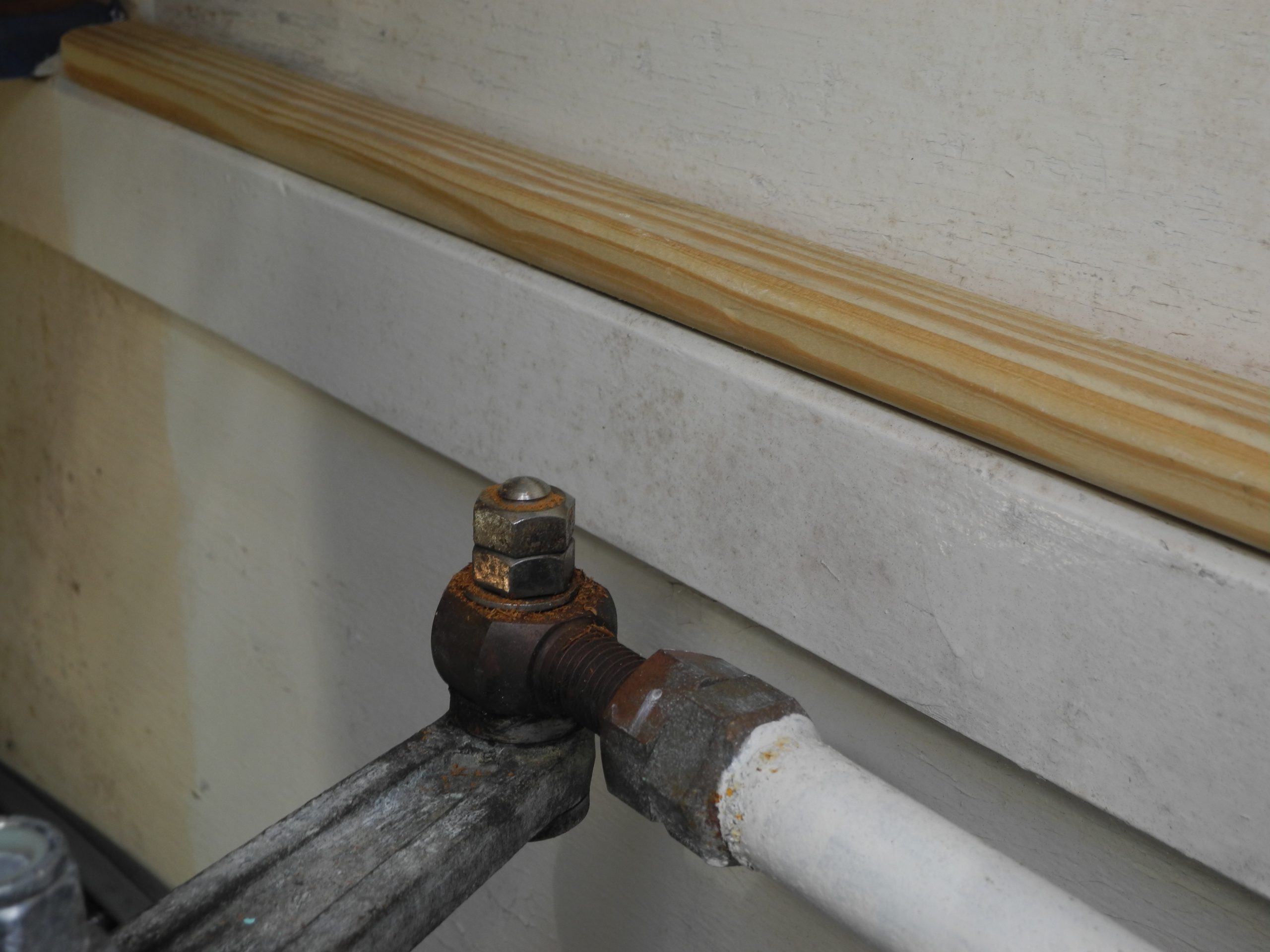 Because it is a mechanical design, this was easy to look at everything to see if it was OK…or not. We inspected the chains, the cables & pulleys and all appeared fine. We emptied fenders, docklines and spare anchors from the lazarette to search for any problem back there. As I lifted the teak floorboards I noticed sawdust on the acorn nut securing the port and starboard rudders in unison. SAWDUST, on a fiberglass boat? Hmm… I looked under the floorboard framework and saw a deep gouge in the wood frame.