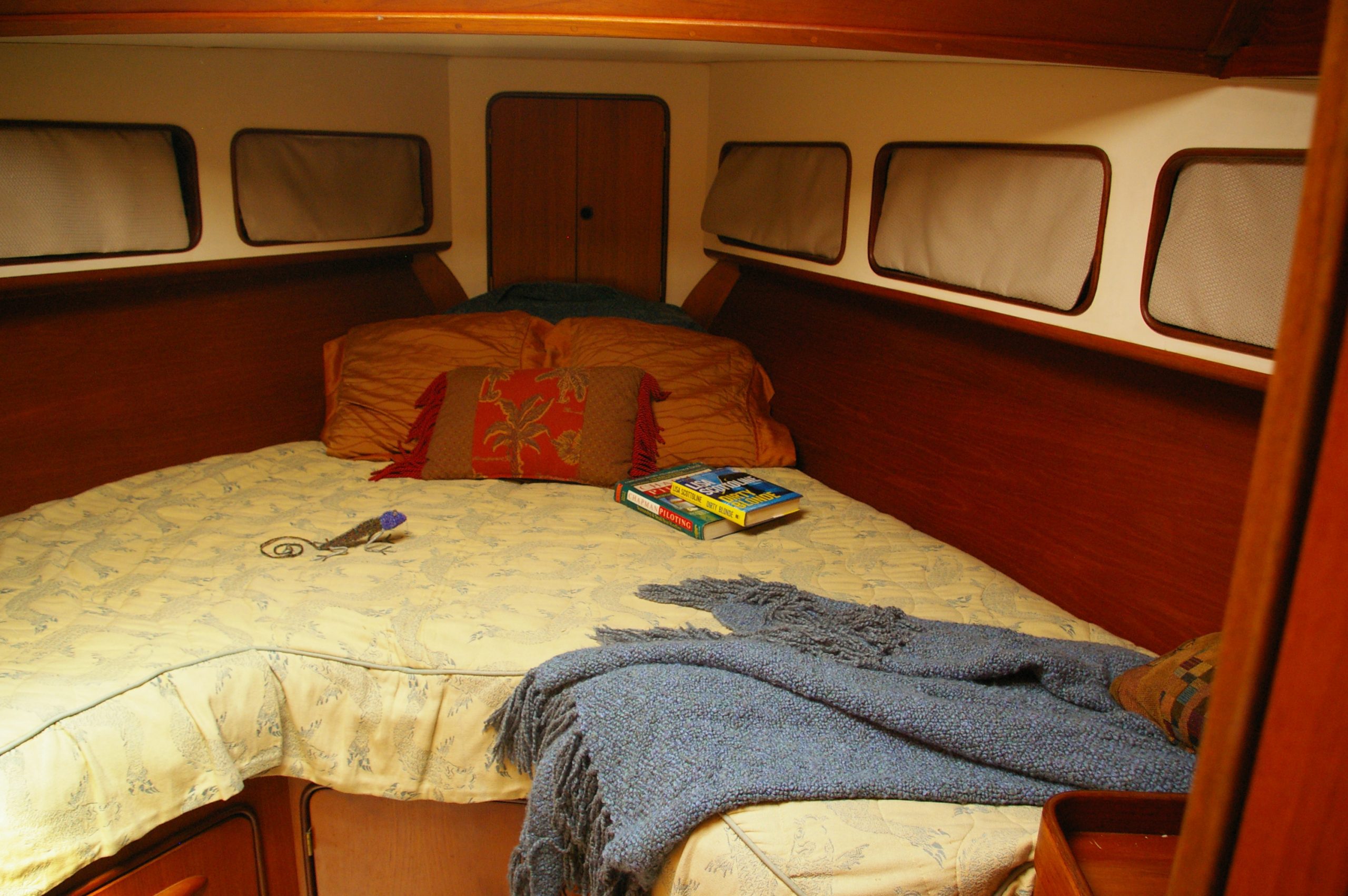 Let’s go forward to the guest cabin veeberth. The boat builders designed incredible use of space for a guest cabin by inserting open shelving on both sides of the berth. Did I say open shelving? Even the neatest Felix Unger would have a hard time keeping these shelves from looking like clutter keepers. Bed skirt material converted into cubby curtains covers a multitude of sins. (say that three times fast!)