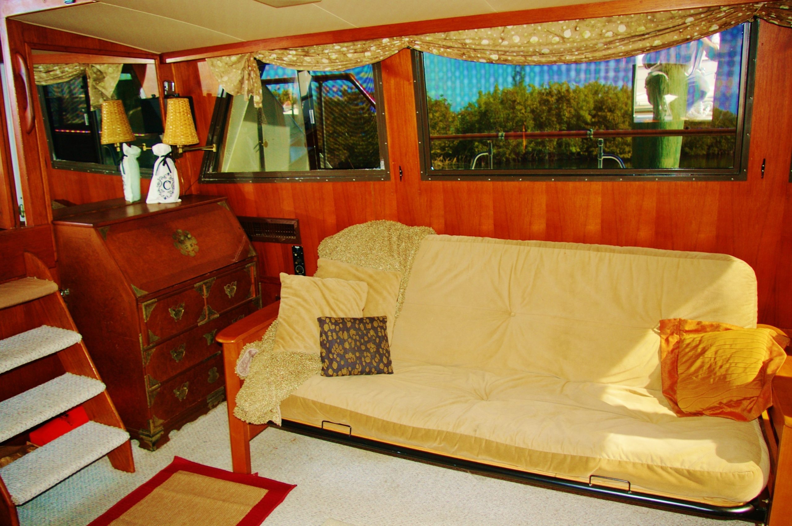 Lucky me! The trawler my husband found for us was perfect: queen master, plenty of storage space, and a terrific aft deck for entertaining. I wasn’t impressed with the stand-up engine room, walk around side decks or twin engines. But I learned to appreciate those features and more as I fell in love with our SANDY HOOK. Because Chris’s definition of good furniture involves the endangered nauga-hide, it was up to me to make this functional boat a comfy place to be.