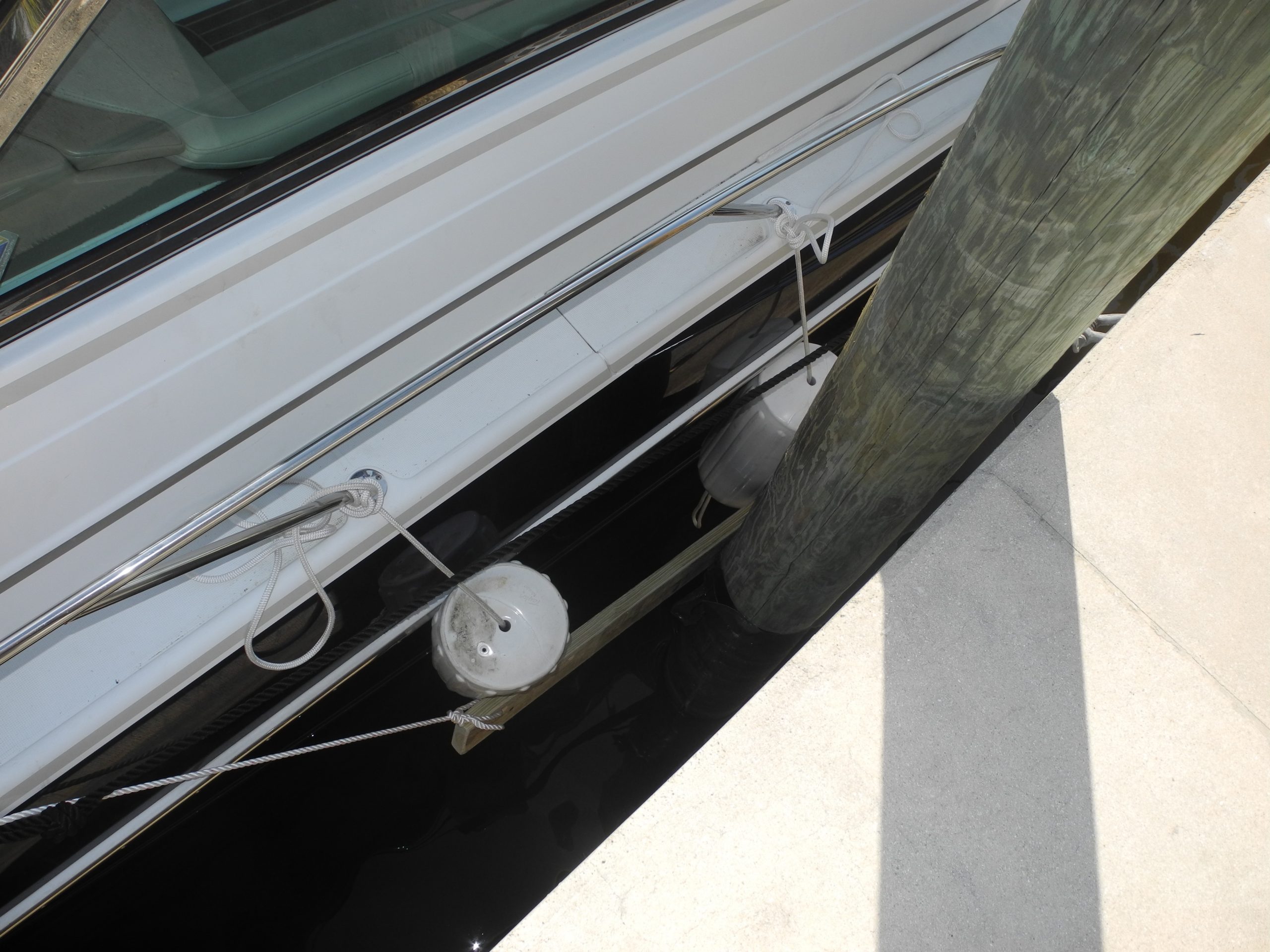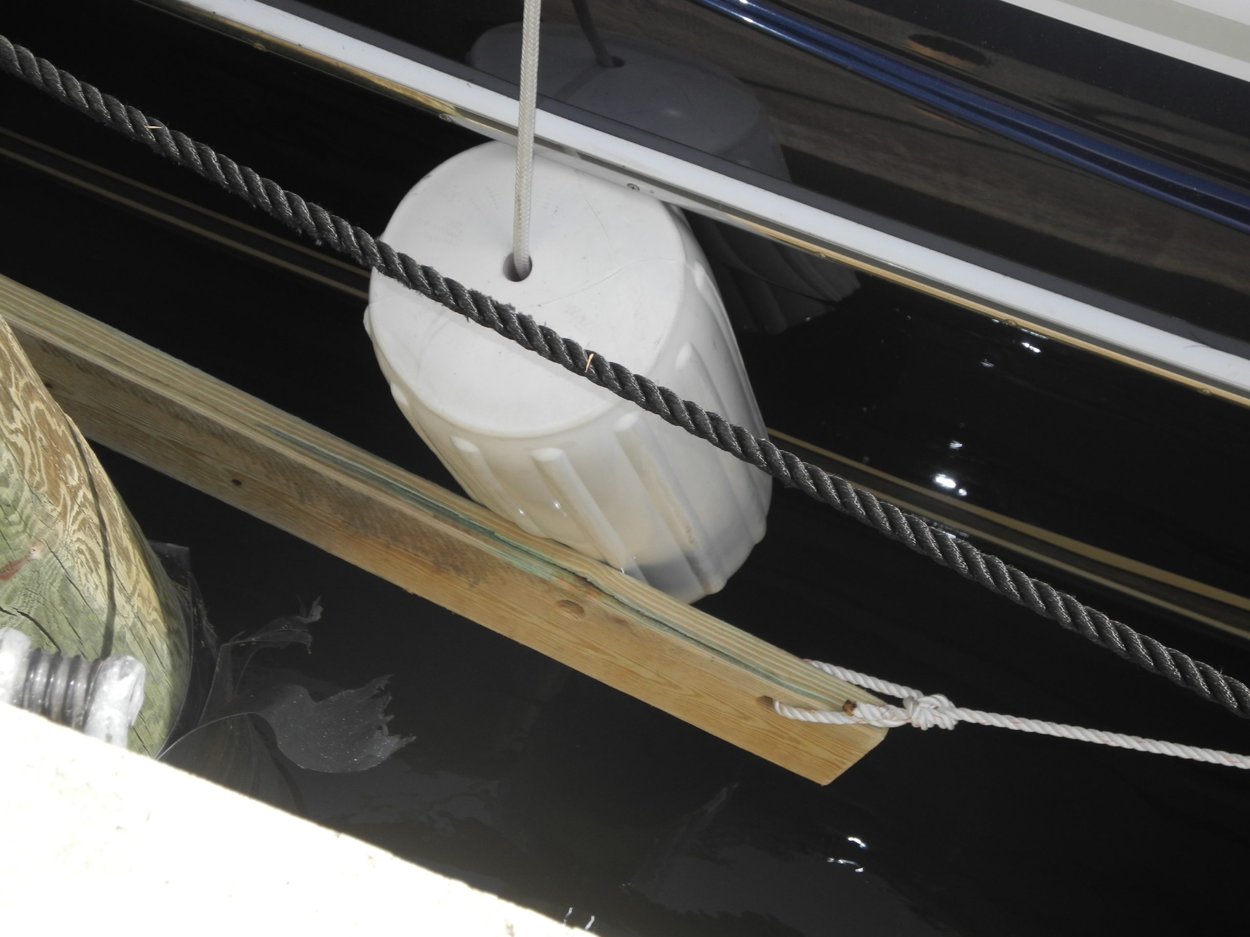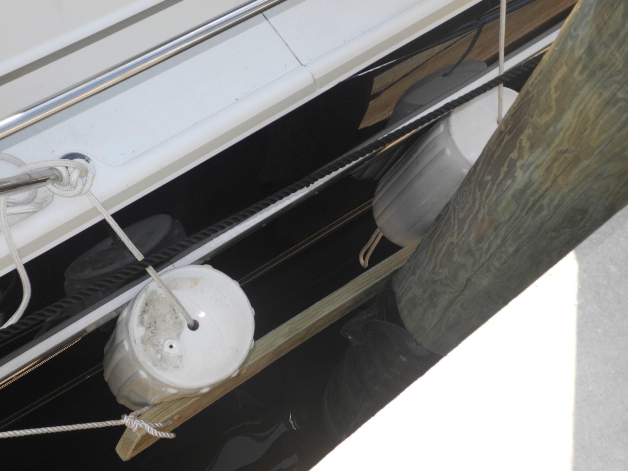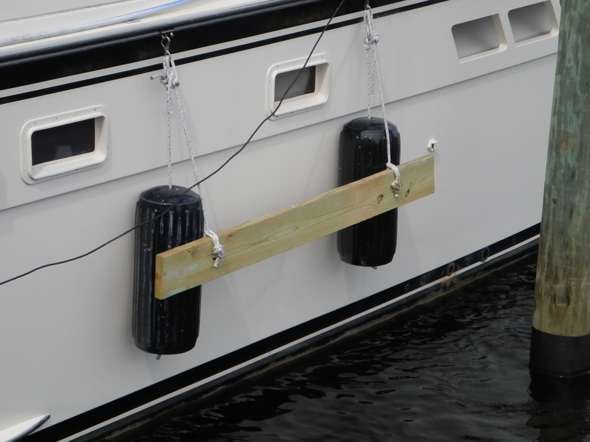 The concept is simple. Place two or more barrel fenders against your hull and secure to your boat. Next, take a board of the appropriate length to straddle the piling that protrudes out from the dock or pier. The board should have one hole on each end to insert a line and then tie each line securely to your boat. The fender board will lie against the piling and now the fenders will stay put and protect your boat from the board and the piling.