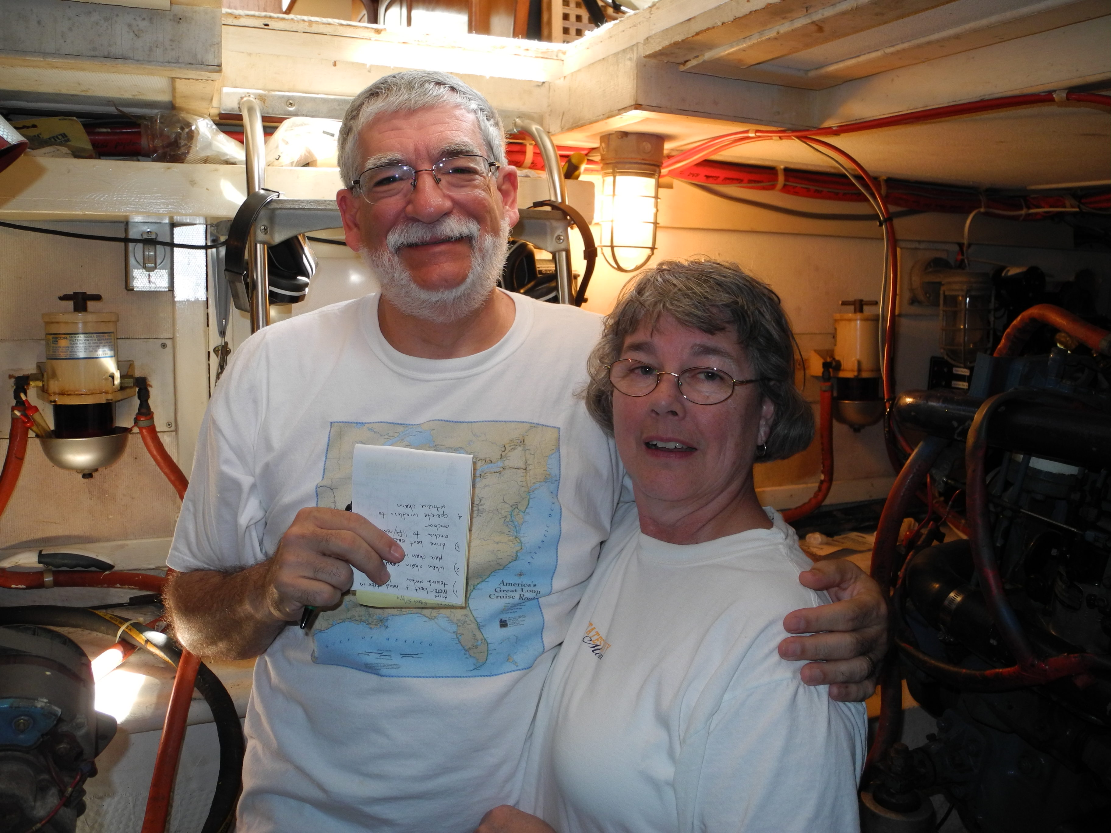 Our mornings in the engine room clarified that checking fluids is more than looking at the oil dipstick. Engine room checks included all the strainers- air conditioner, generator and the main engine. We also reviewed the sea water or raw water cooling system We traced the route that it takes to cool different components of the engine as it makes its way from the engine out the exhaust hose through the transom. A cool engine is a happy engine, for sure.