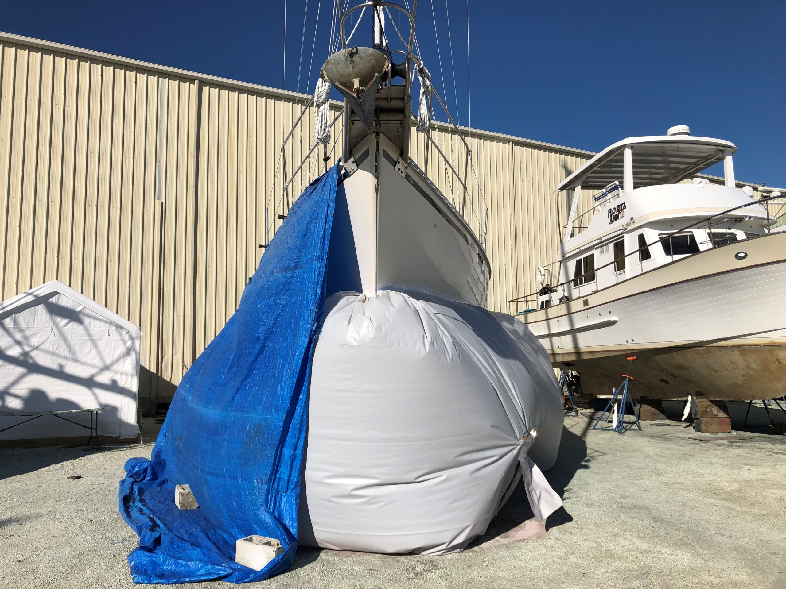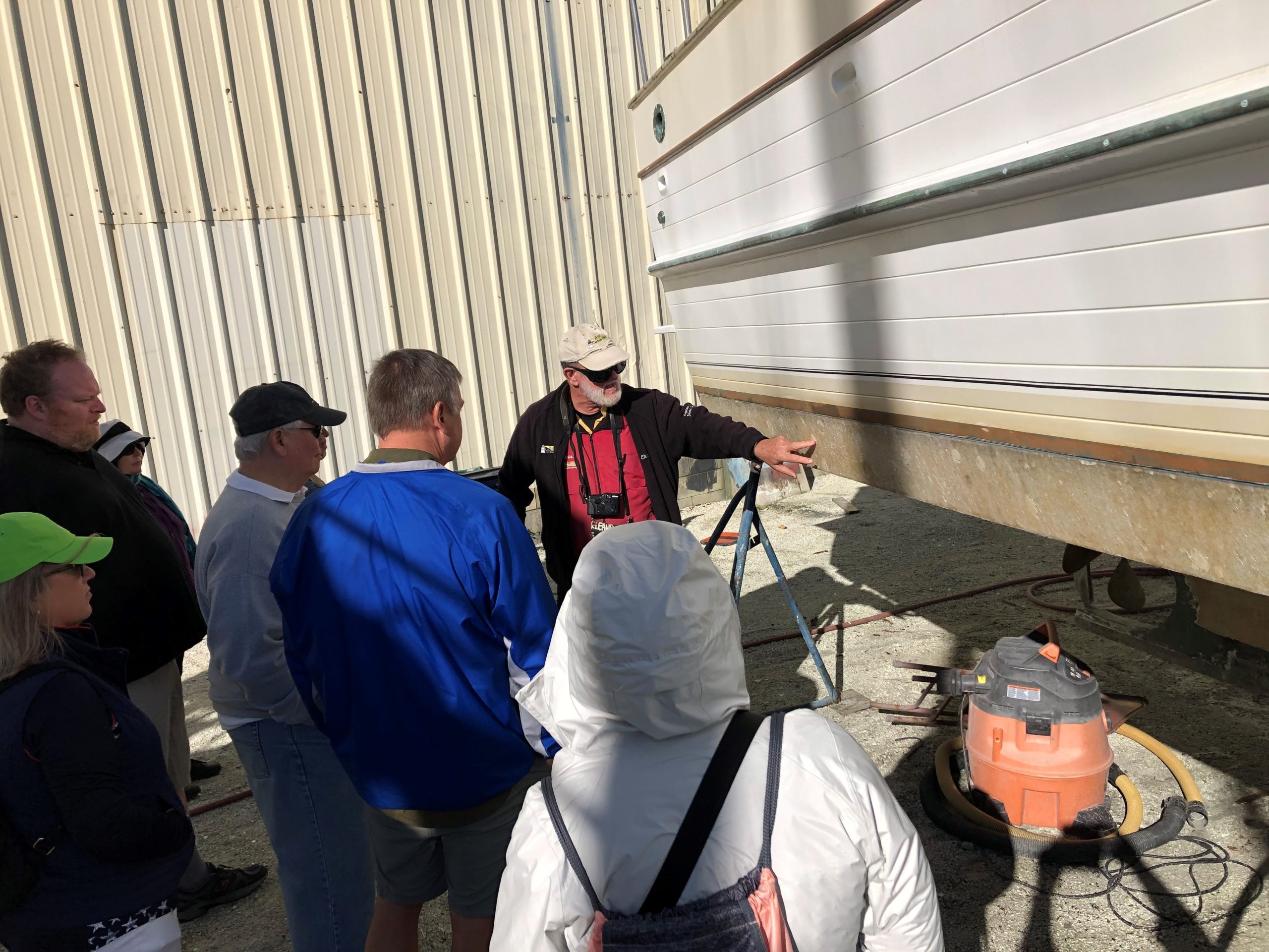 After a sold-out Cruising FUNdamentals seminar, many of our students joined us for a Sunday morning Boat Yard Tour at Cracker Boy’s Boat Works in Fort Pierce, Florida. With permission from the boat yard, we meander through the rows of boats ready to talk about each and every piece of equipment we encounter on a sunny Florida morning. Yup, the wind was a bit stiff. But 60s in January? We are a happy crew!