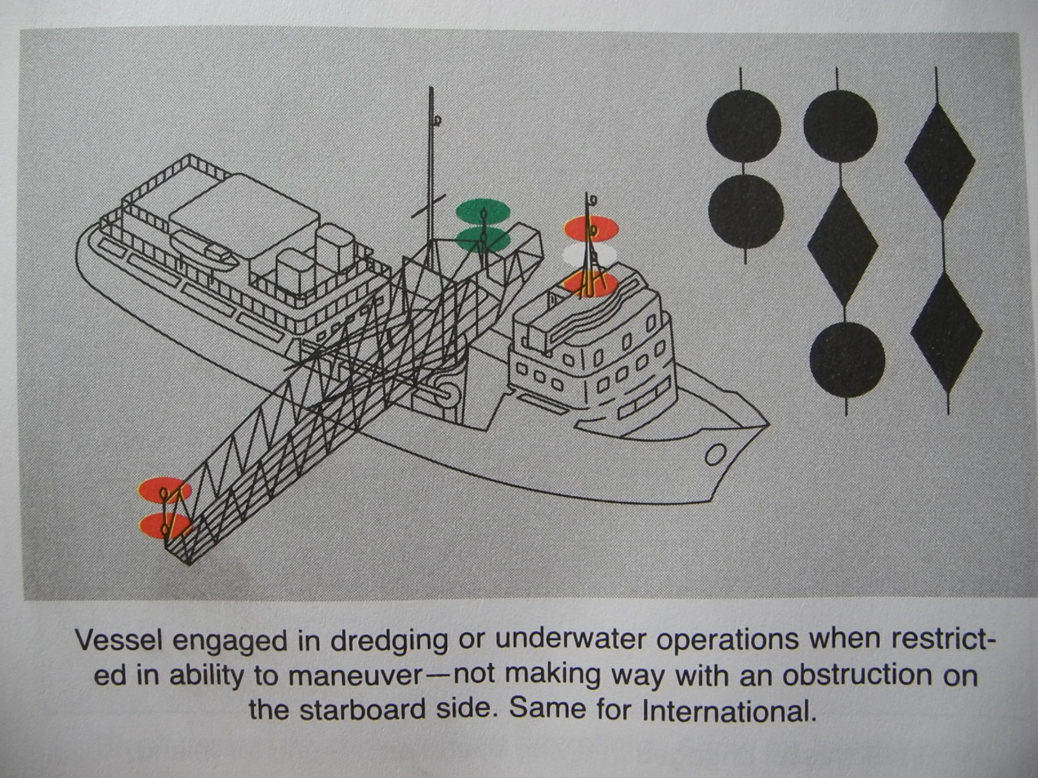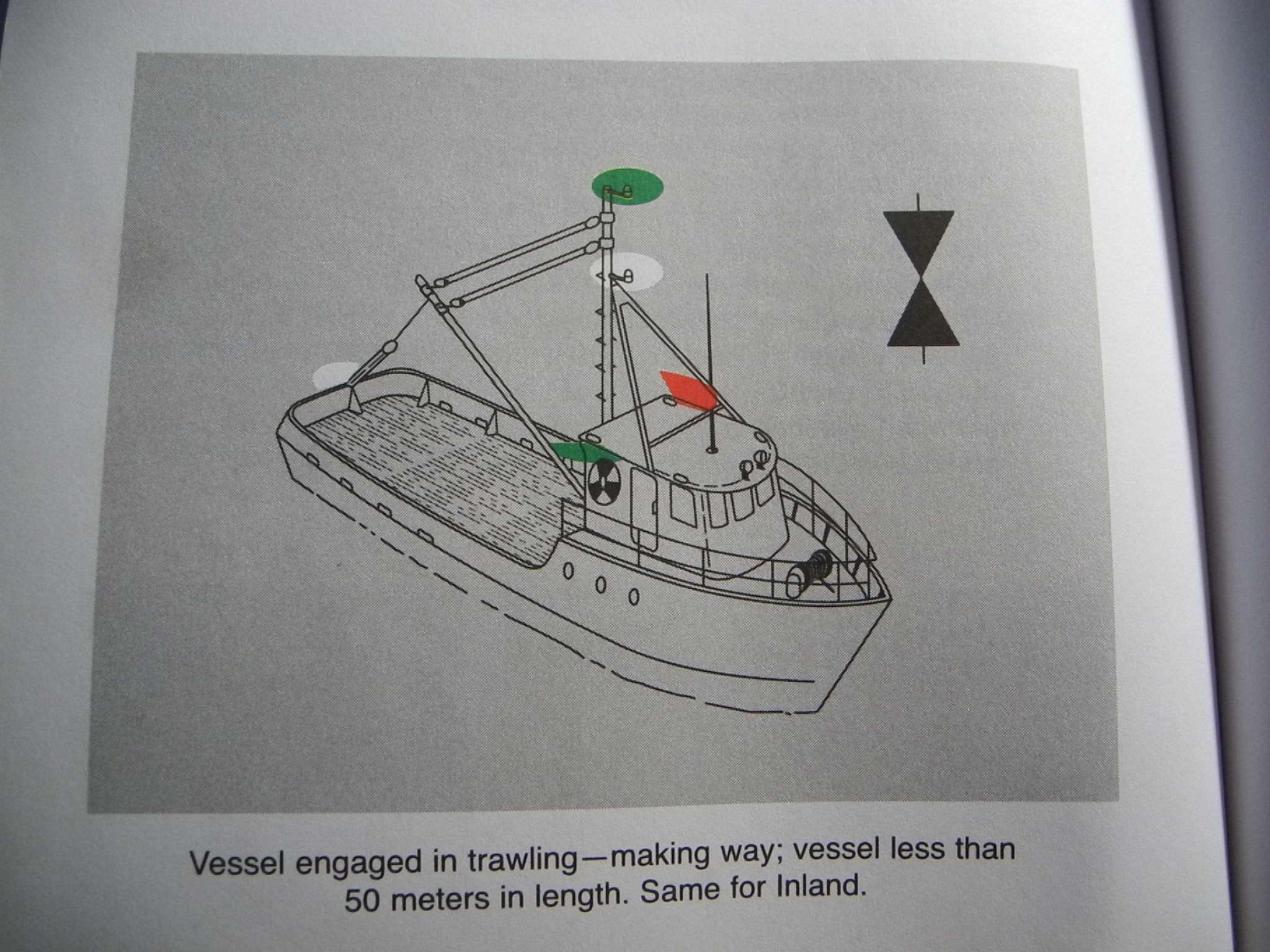 Next time you see a shrimp trawler don’t just assume it is fishing. Check for the day shape in day time or lights at night. And what about a dredge? What side is it safe for you to go around. The answer is in The White Book.