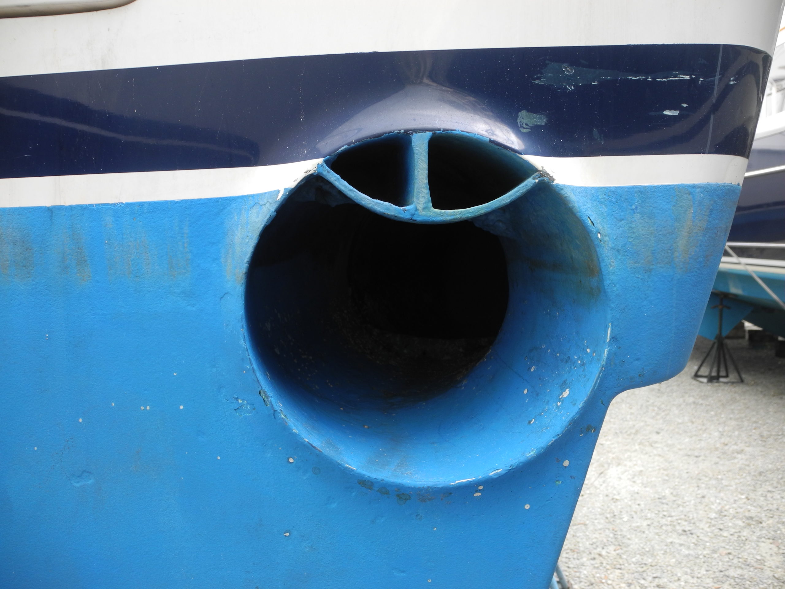 Bow thruster with debris protection bars. Sometimes this works. sometimes small stuff still gets through.
