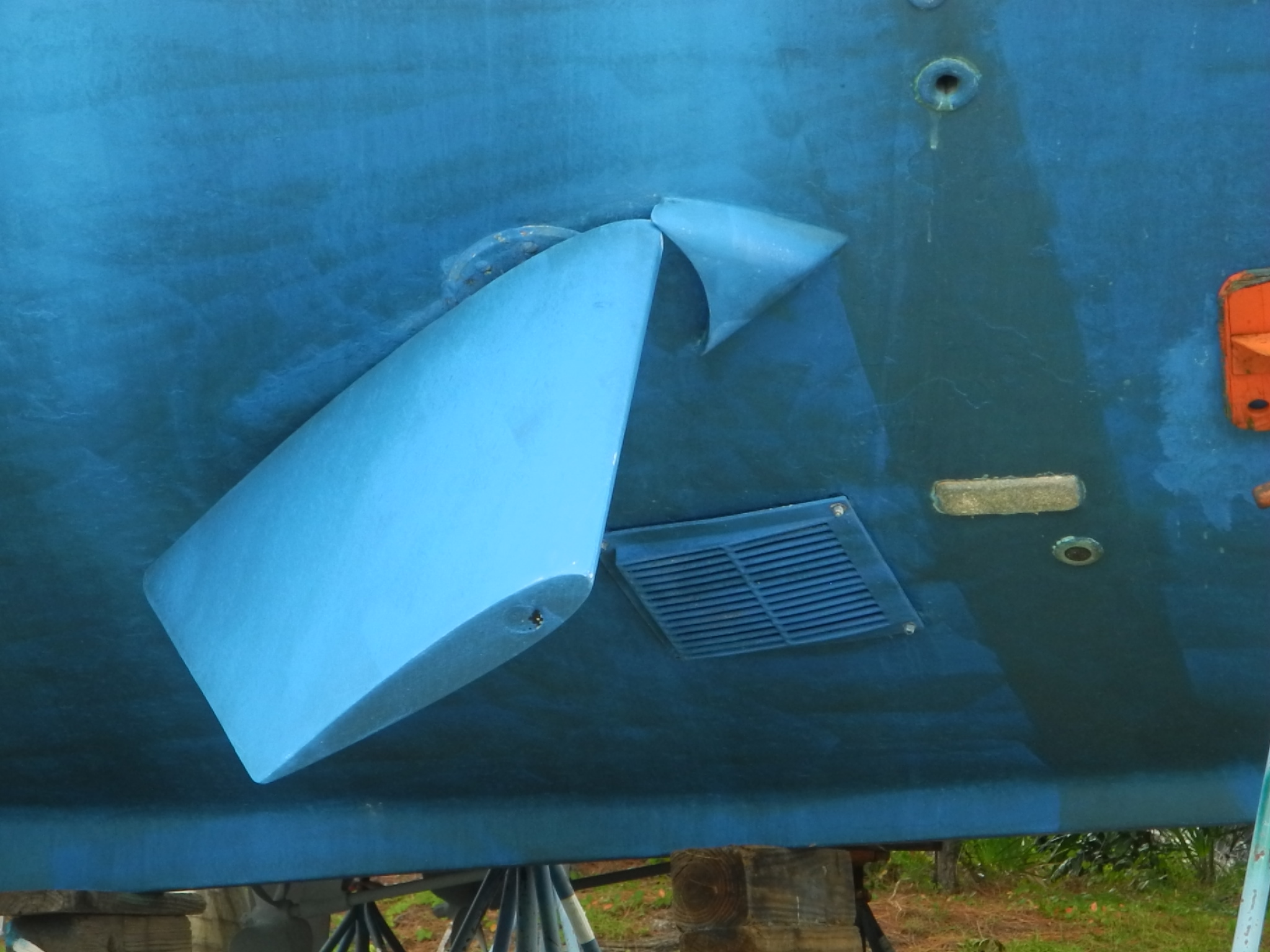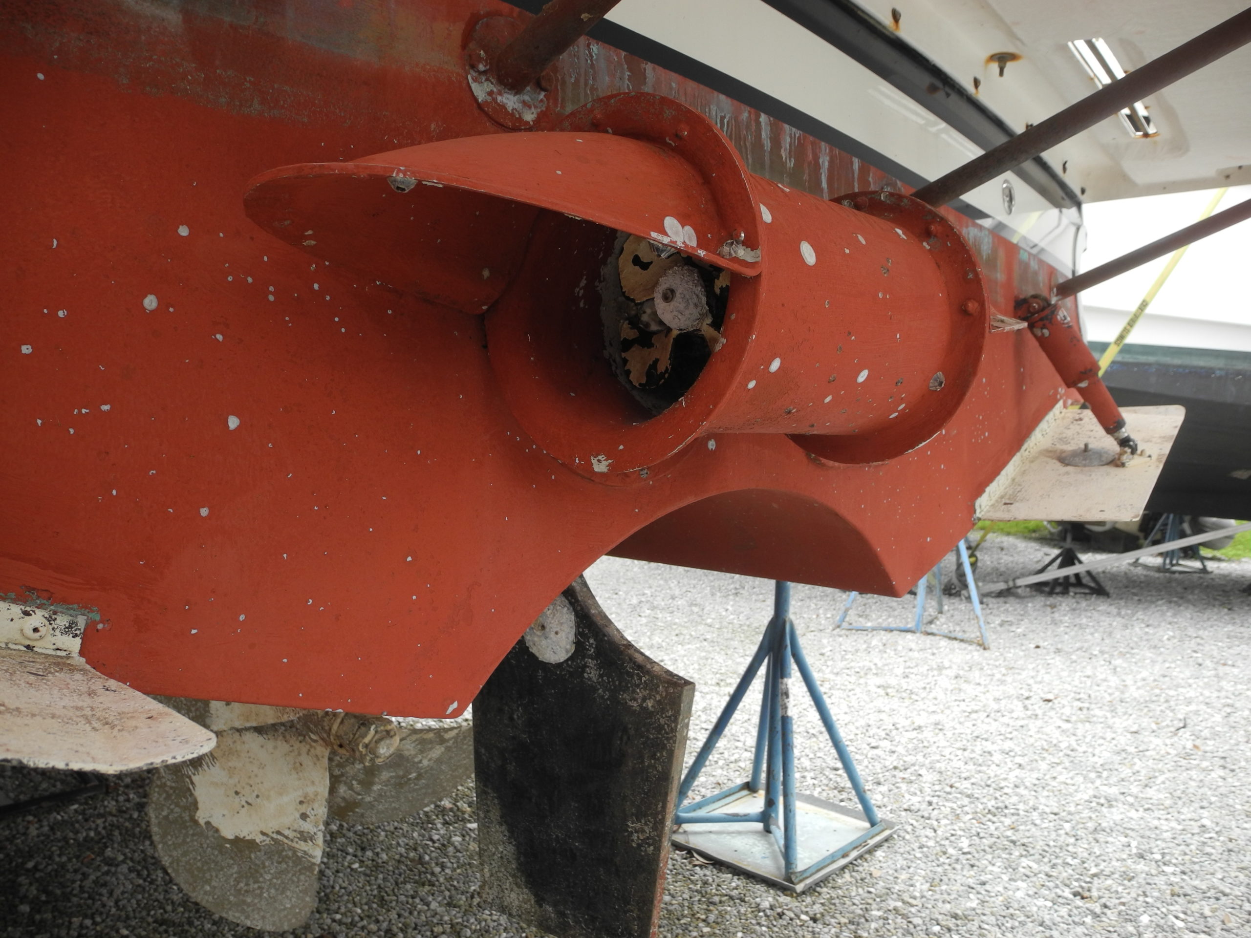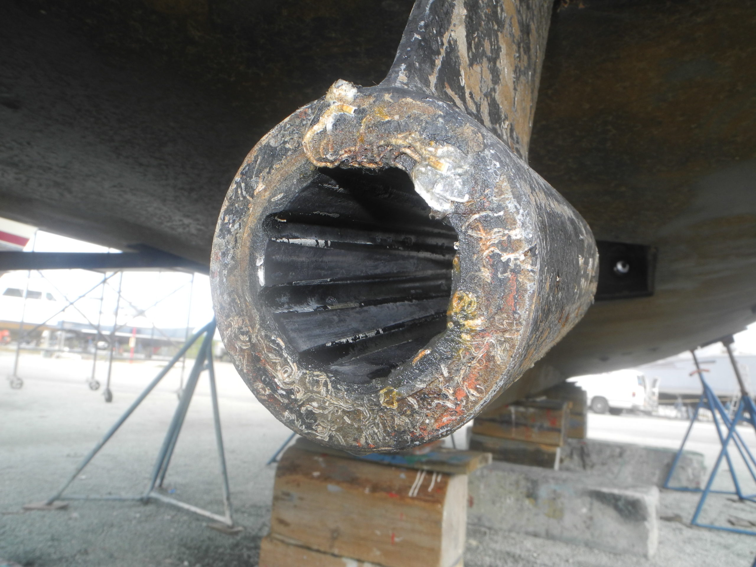 Main engine exhaust, strap here to avoid the skeg when hauling out.
