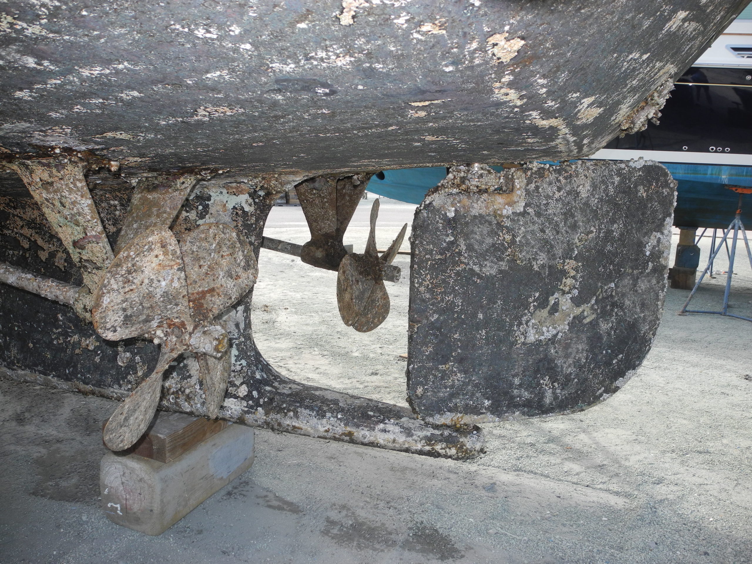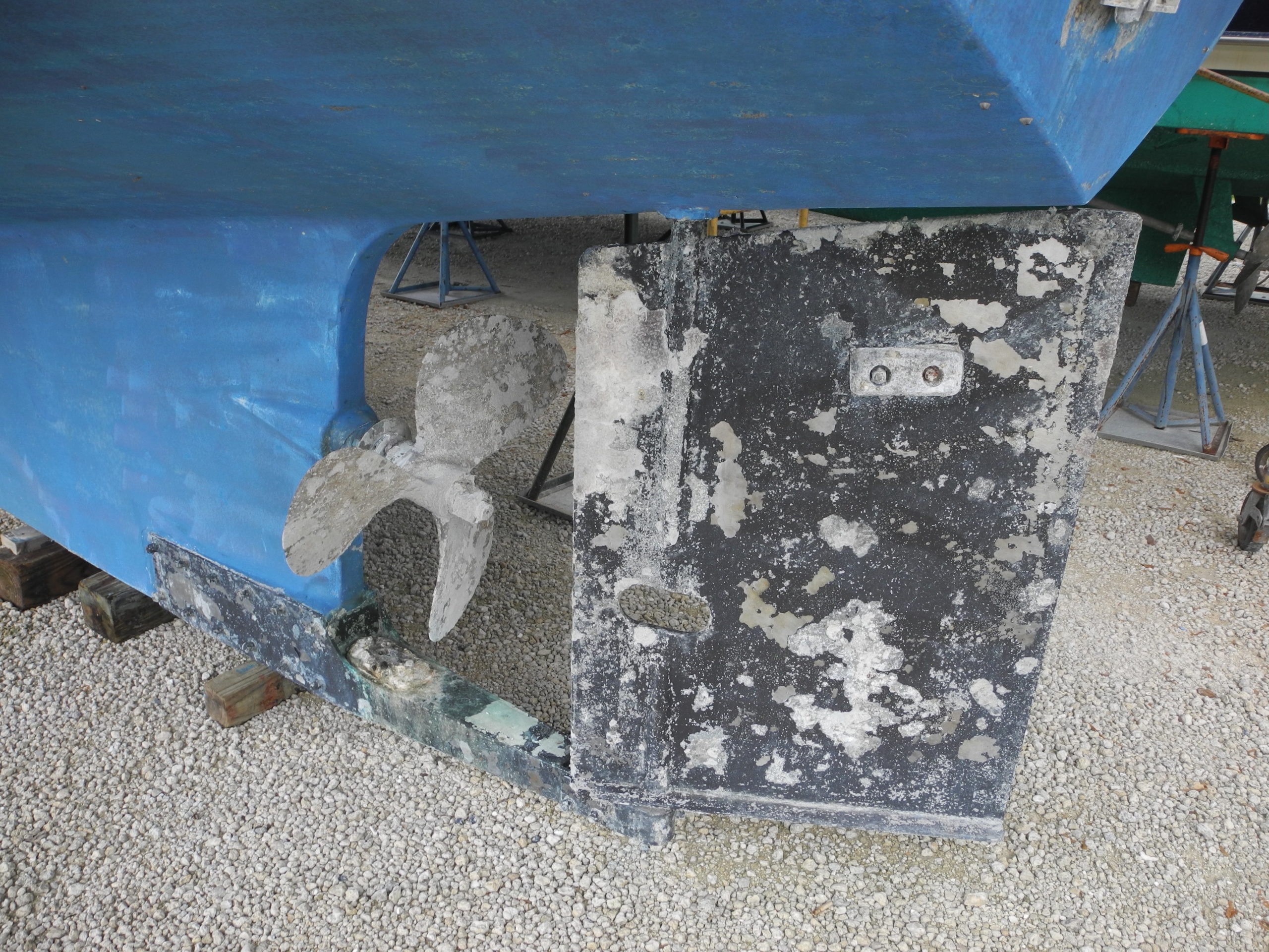 Prop pocket. NOTICE the shaft and rudder are out of alignment. This is intentional to remove the shaft without dropping the rudder. Great Idea.